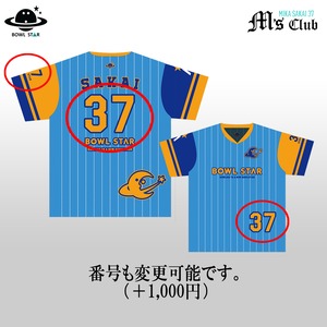 ブルーベースにイエローの文字と袖が映えるこのユニフォームは、酒井美佳プロの誕生日「3月7日」を象徴する「37」の数字がしっかりとデザインされています。「Mika, Miracle」を表す「M」の文字も加えられ、個性と輝きを引き立てます。野球のユニフォームからインスピレーションを得たスポーティなデザインで、少しポップな雰囲気を取り入れた、遊び心のある一着です。